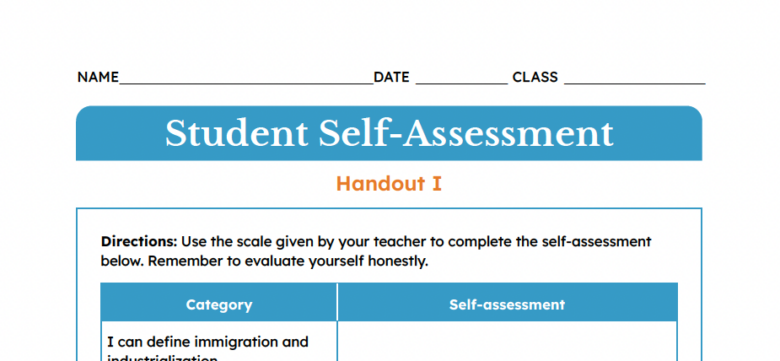 Page:Resources LibraryArrow iconCurriculum:ElementaryArrow iconLesson:Industrialization and ImmigrationStudent Self-Assessment Handout | Industrialization and ImmigrationA self-reflection activity that allows students to internalize their learning.