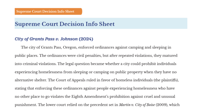 The city of Grants Pass, Oregon, enforced ordinances against camping and sleeping in public places. The ordinances were civil penalties, but after repeated violations, they matured into criminal violations. The legal question became whether a city could prohibit individuals experiencing homelessness from sleeping or camping on public property when they have no alternative shelter. The Court of Appeals ruled in favor of homeless individuals (the plaintiffs), stating that enforcing these ordinances against people experiencing homelessness who have no other place to go violates the Eighth Amendment’s prohibition against cruel and unusual punishment. The lower court relied on the precedent set in Martin v. City of Boise (2009), which held that punishing unsheltered individuals for sleeping outside when they have no other alternatives is unconstitutional. In a 6-3 decision, the Supreme Court ruled the city of Grants Pass ordinances did not violate the constitutional protections of the Eighth Amendment. The majority opinion of the court included:
