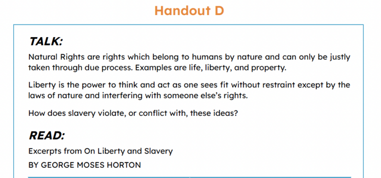 An activity that guides students through Excerpts from On Liberty and Slavery by George Moses Horton.