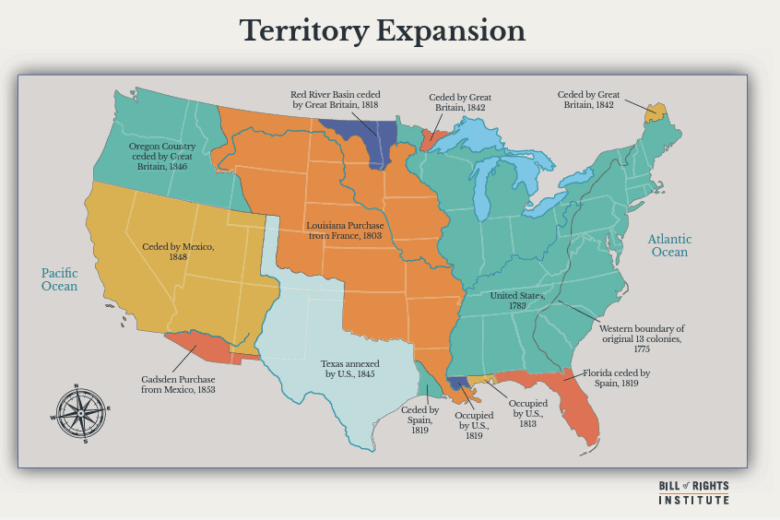 A map that shows how the territory claimed by the United States has expanded through treaties and purchases since 1775.