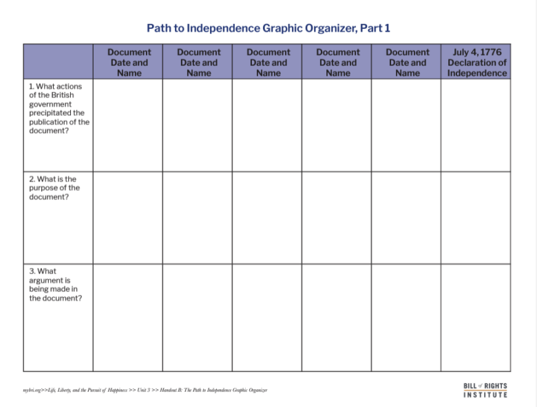 A graphic organizer that helps student understand the documents that proceeded the Declaration of Independence in the Colonist relationship to the British Parliament.