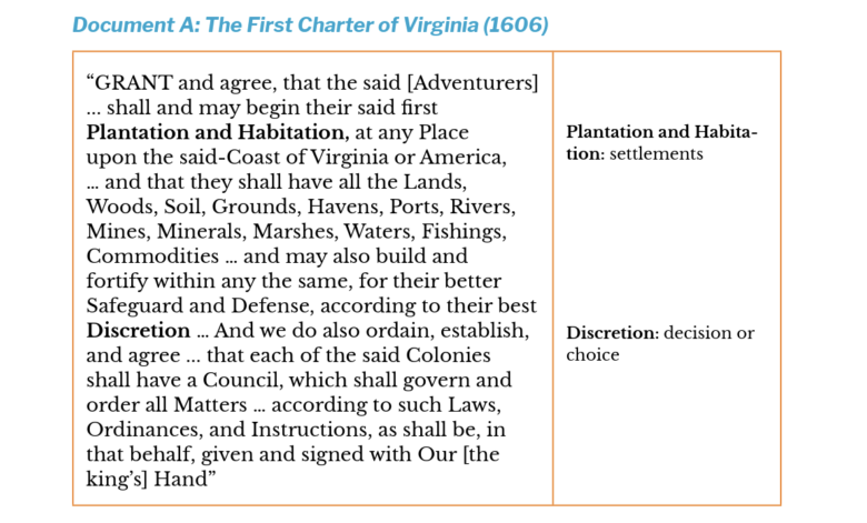| “GRANT and agree, that the said [Adventurers] … shall and may begin their said first Plantation and Habitation, at any Place upon the said-Coast of Virginia or America, . . . and that they shall have all the Lands, Woods, Soil, Grounds, Havens, Ports, Rivers, Mines, Minerals, Marshes, Waters, Fishings, Commodities . . . and may also build and fortify within any the same, for their better Safeguard and Defense, according to their best Discretion… And we do also ordain, establish, and agree … that each of the said Colonies shall have a Council, which shall govern and order all Matters … according to such Laws, Ordinances, and Instructions, as shall be, in that behalf, given and signed with Our [the king’s] Hand” | Plantation and Habitation- settlements