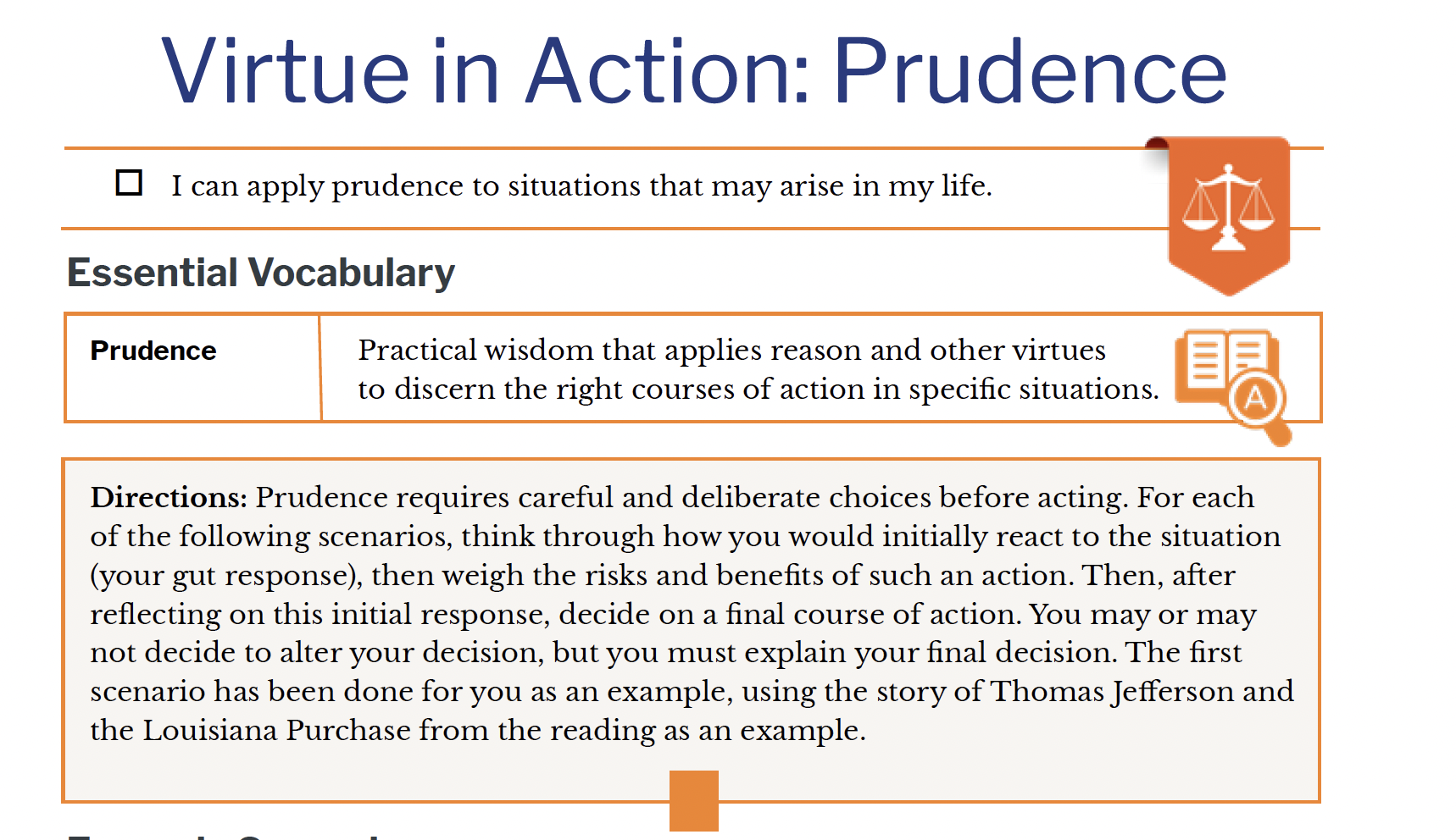 Directions: Prudence requires careful and deliberate choices before acting. For each of the following scenarios, think through how you would initially react to the situation (your gut response), then weigh the risks and benefits of such an action. Then, after reflecting on this initial response, decide on a final course of action. You may or may not decide to alter your decision, but you must explain your final decision. The first scenario has been done for you as an example, using the story of Thomas Jefferson and the Louisiana Purchase from the reading as an example.