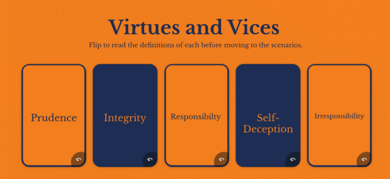 Page:Resources LibraryArrow iconCurriculum:Government and Politics: Civics for the American ExperimentArrow iconUnit:Unit 4: The President and the BureaucracyArrow iconLesson:The Roles of the PresidentVirtues and VicesA card flip interactive that defines virtues and vices.