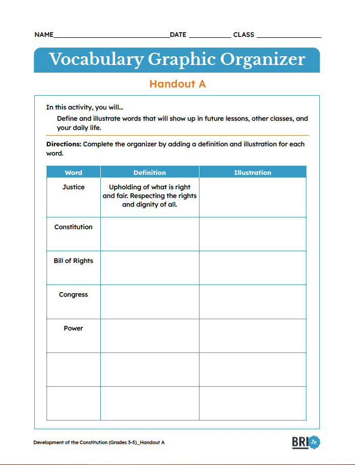 Page:Resources LibraryArrow iconCurriculum:ElementaryArrow iconLesson:Development of the ConstitutionVocabulary Graphic Organizer | ElementaryAn activity to help students define and illustrate words that will show up in their daily lives.