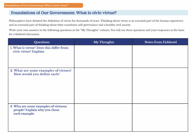 A pre-activity for the fishbowl discussion that helps students pre-form their responses to questions about virtue.