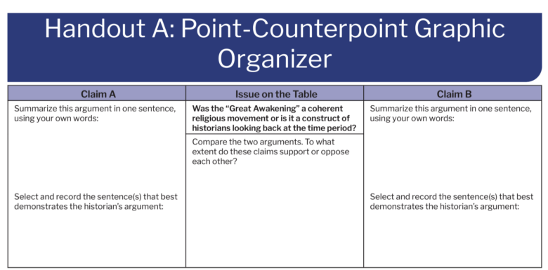 A handout to accompany the scholarly claims made in the corresponding Point-Counterpoint readings that helps student synthesize the claims put forth.