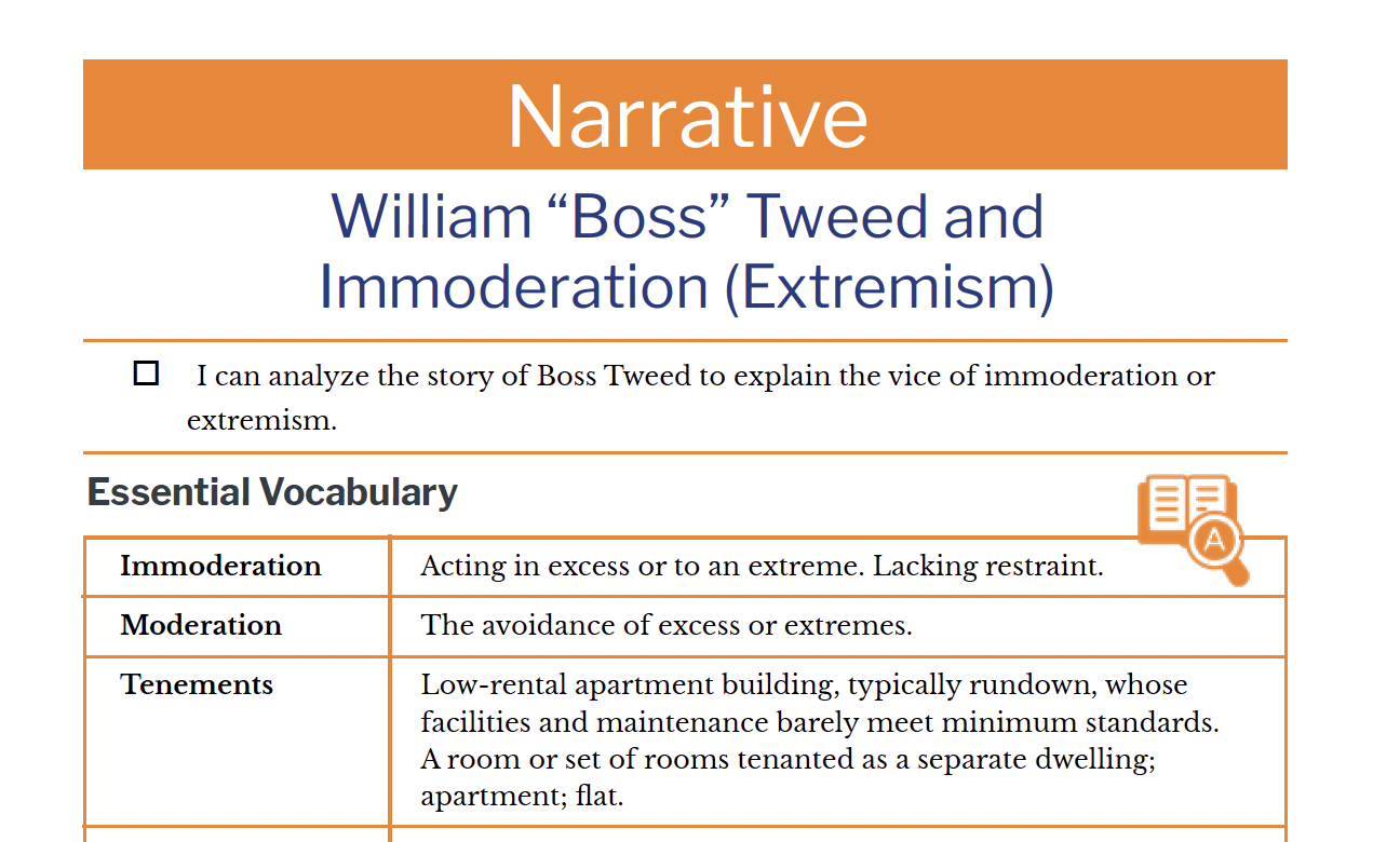 - I can analyze the story of Boss Tweed to explain the vice of immoderation or extremism.