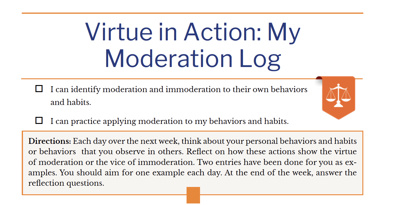 Directions: Each day over the next week, think about your personal behaviors and habits or behaviors that you observe in others. Reflect on how these actions show the virtue of moderation or the vice of immoderation. Two entries have been done for you as examples. You should aim for one example each day. At the end of the week, answer the reflection questions.