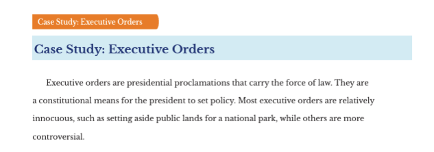 Executive orders are presidential proclamations that carry the force of law. They are a constitutional means for the president to set policy. Most executive orders are relatively innocuous, such as setting aside public lands for a national park, while others are more controversial.