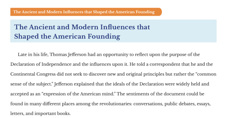 Late in his life, Thomas Jefferson had an opportunity to reflect upon the purpose of the Declaration of Independence and the influences upon it. He told a correspondent that he and the Continental Congress did not seek to discover new and original principles but rather the “common sense of the subject.” Jefferson explained that the ideals of the Declaration were widely held and accepted as an “expression of the American mind.” The sentiments of the document could be found in many different places among the revolutionaries: conversations, public debates, essays, letters, and important books.