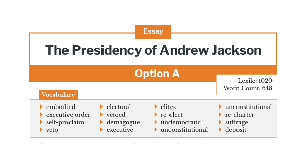 - Vocabulary: embodied, electoral, elites, unconstitutional, executive order, vetoed, re-elect, re-charter, self-proclaim, demagogue, undemocratic, suffrage, veto, executive, unconstitutional, deposit