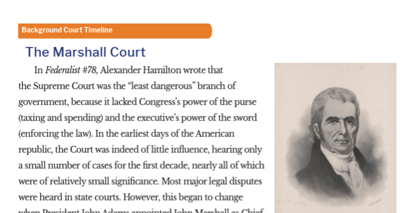 In Federalist #78, Alexander Hamilton wrote the Supreme Court was the “least dangerous” branch of government, because it lacked Congress’ power of the purse (taxing and spending) and the executive’s power of the sword (enforcing the law). In the earliest days of the American republic, the Court was indeed of little influence, hearing only a small number of cases for the first decade, nearly all of which were of relatively small significance. Most major legal disputes were heard in state courts. However, this began to change when President John Adams appointed John Marshall as Chief Justice of the Supreme Court in 1801.
