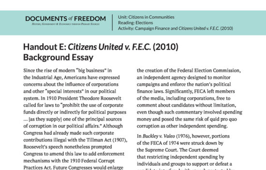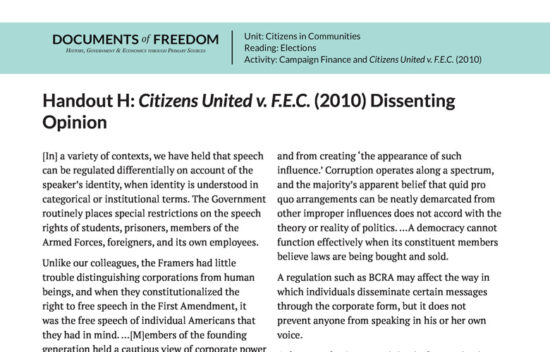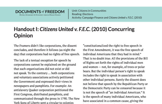 Page:HomeArrow iconCategory:PlaylistsLandmark Supreme Court Cases: Citizens United v F.E.C.Citizens United v. FShow moreSave to My LibraryShare11 ItemsReorderCitizens United v. F.E.C. (2010)Lesson·5 ActivitiesOpen context menuRemove from playlistExploring Civil and Economic Freedom Essay – Citizens United v. F.E.C. (2010)ActivityOpen context menuRemove from playlistHandout B: Background Essay – Citizens United v. F.E.C. (2010)ActivityOpen context menuRemove from playlistHandout B: Citizens United v. F.E.C. (2010) BackgroundActivityOpen context menuRemove from playlistHandout C: Citizens United v. F.E.C. (2010) – Timeline of Campaign Finance Reform InitiativesActivityOpen context menuRemove from playlistDocuments to Examine (A-M) – Citizens United v. F.E.C. (2010)ActivityOpen context menuRemove from playlistHandout E: Citizens United v. F.E.C. (2010) Background EssayActivityOpen context menuRemove from playlistHandout G: Citizens United v. F.E.C. (2010) Majority OpinionActivityOpen context menuRemove from playlistHandout H: Citizens United v. F.E.C. (2010) Dissenting OpinionActivityOpen context menuRemove from playlistHandout I: Citizens United v. F.E.C. (2010) Concurring OpinionActivityOpen context menuRemove from playlistHandout J: Evaluation of Citizens United v. F.E.C. (2010)ActivityOpen context menuRemove from playlist